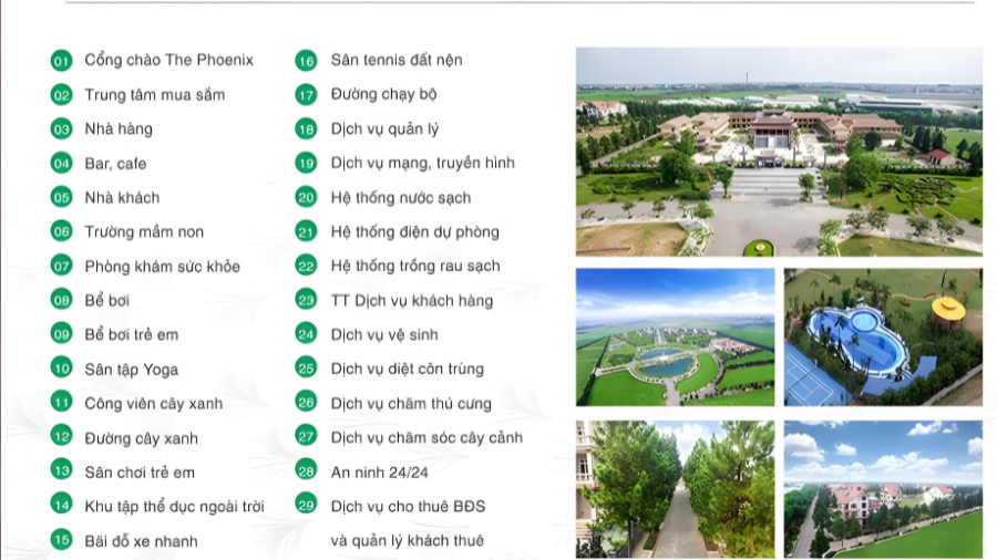 The Phoenix Garden được quy hoạch là một khu đô thị "all-in-one" với đầy đủ các tiện ích nội khu đẳng cấp như: Khu tâm linh, trung tâm thương mại, khách sạn, nhà hàng, bể bơi ngoài trời, sân tennis đất nện và khu vui chơi giải trí, mang đến một cuộc sống bền vững và an lành.